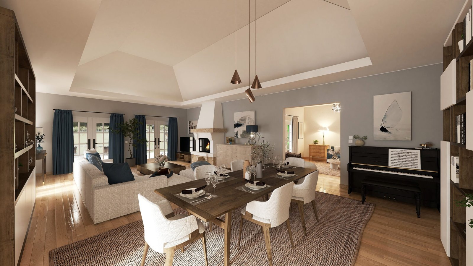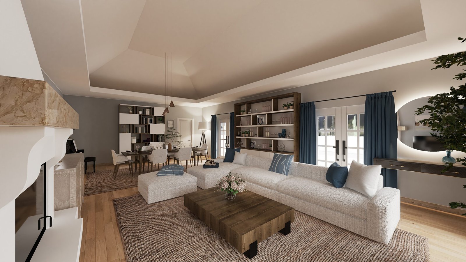A whole residential house design with interiors and exteriors. Interiors requested to be in the style of a contemporary farmhouse design with natural materials and textures contrasting blue hues with dark browns. Artworks from Gabriella King on the walls soft fabrics for all seating. Main focus on the fireplace.